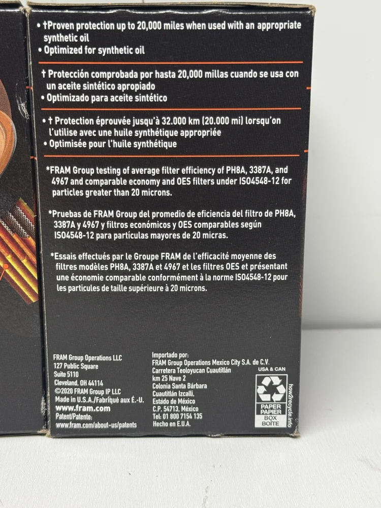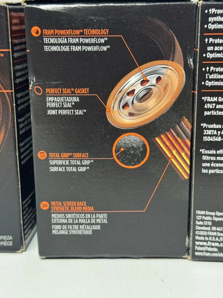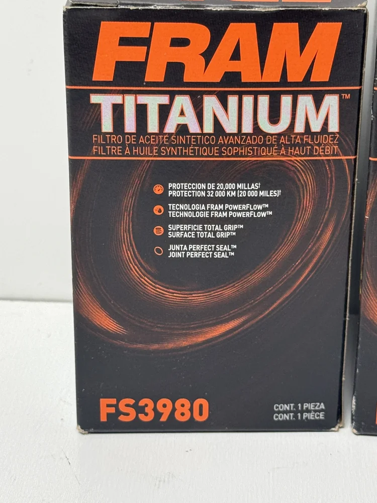 The Fram Titanium FS3980 Oil Filters 3 Pack delivers advanced high-flow synthetic oil filtration and superior engine protection. This convenient 3-pack of premium oil filters is engineered for extended service intervals up to 20,000 miles when used with synthetic oil.