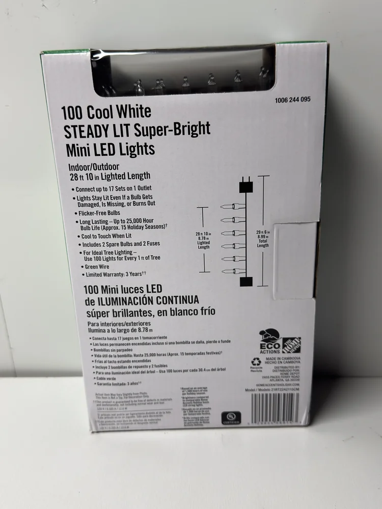 The Home Accents 100 Cool White Mini LED Lights are a reliable, energy-efficient string light set designed to deliver a crisp, modern cool white glow with steady constant-on illumination. This 100-light set provides beautiful, consistent lighting without flashing or twinkling, making it perfect for both festive holiday displays and year-round home decor accents.