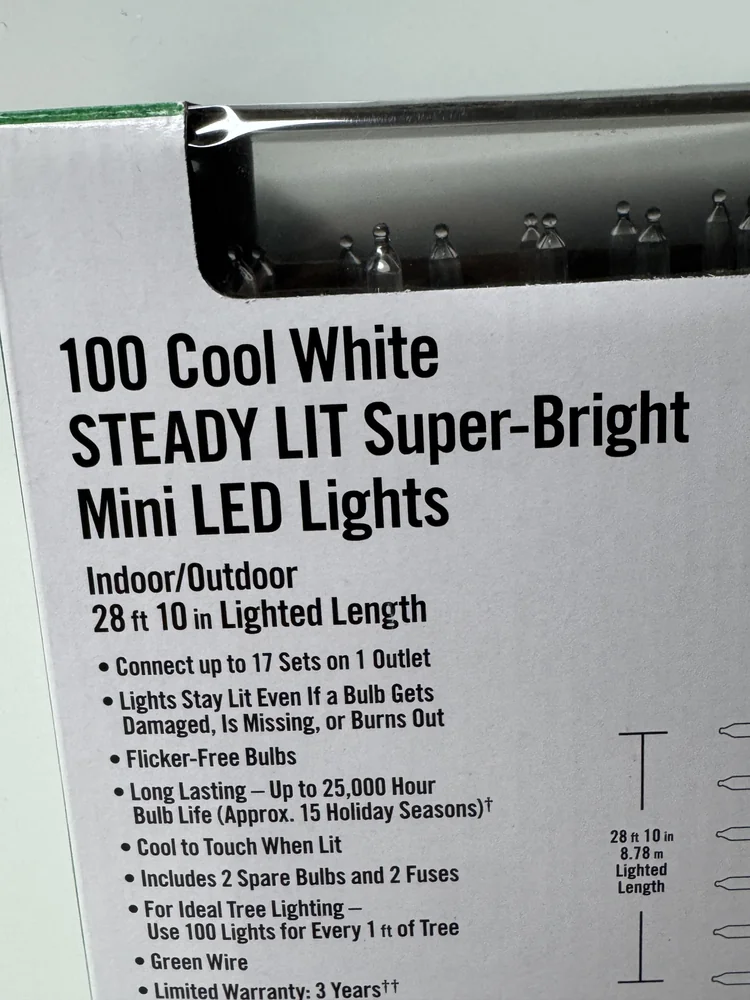 • 100 super-bright cool white mini LEDs with steady-lit (constant-on) illumination